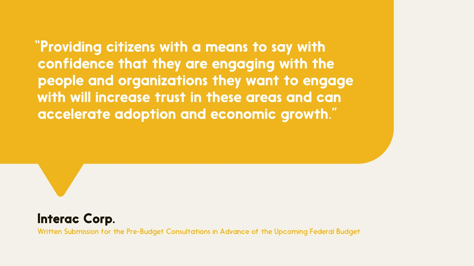 Digital ID enables all Canadians to engage digitally in a secure, privacy-enhancing manner across a variety of areas such as new government e-services, consumer directed finance, digital health, real-time payments and connected cities. In a world where a high percentage of our interactions are not done face-to-face, providing citizens with a means to say with confidence that they are engaging with the people and organizations they want to engage with will increase trust in these areas and can accelerate adoption and economic growth.