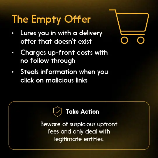 What’s the scam? Scammers send fake delivery notifications or payment requests for non-existent packages, exploiting online shoppers.