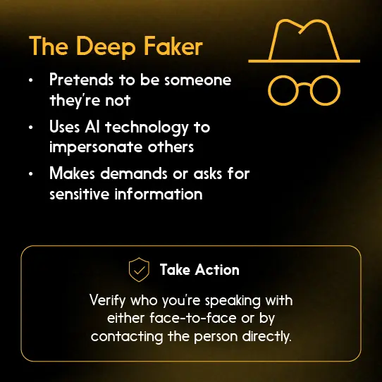 What’s the scam? It seems like everyone’s talking about the power of machine learning — often better known as artificial intelligence, or AI. And yes, it is impressive, but beware of AI’s power to deceive: Experts are warning of AI-enabled scams that leverage the technology to allow fraudsters to convincingly impersonate trusted people and organizations. Some criminals are using AI to fake specific people’s voices over a phone call (“deepfakes”).