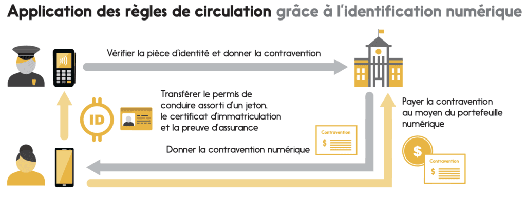 Les gouvernements en profiteraient aussi. En effet, les coûts et les efforts relatifs à l’impression, à l’envoi, à la collecte, au tri et à l’archivage des formulaires et des contraventions papier seraient grandement réduits. Les flux de trésorerie s’amélioreraient dans la mesure où les amendes pourraient être réglées immédiatement par paiement numérique. Des contrôles routiers plus rapides et moins de papier permettraient de libérer des ressources sur le terrain et dans les bureaux pour réaliser des tâches plus productives. Les gains en efficacité profiteraient probablement aussi à l’ensemble de l’économie, notamment aux banques qui pourraient offrir l’ouverture de compte en ligne sans avoir à vérifier les documents du client en personne, tout en respectant la réglementation de la « connaissance du client ».