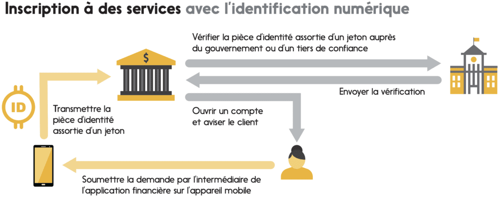 Pour ouvrir un nouveau compte bancaire, elle télécharge d’abord l’application de l’institution financière sur son appareil mobile. En guise de preuve d’identité, elle autorise l’application à transférer l’information assortie d’un jeton que contient son permis de conduire numérique dans l’application gouvernementale – comme mentionné plus haut, la création de jetons remplace les données confidentielles du permis de conduire par des données réparties aléatoirement servant uniquement à authentifier cette opération. L’application remplit automatiquement certains champs de sa demande d’ouverture de compte en utilisant les données de son permis de conduire, et notre conductrice remplit les champs restants. La banque reçoit la demande, et ses systèmes utilisent la carte assortie d’un jeton pour vérifier l’identité de la dame au moyen d’une base de données sécuritaire gérée par le gouvernement ou un tiers de confiance. Quelques secondes après la soumission de sa demande, le compte est ouvert. Elle n’a pas à se rendre en personne à la banque.