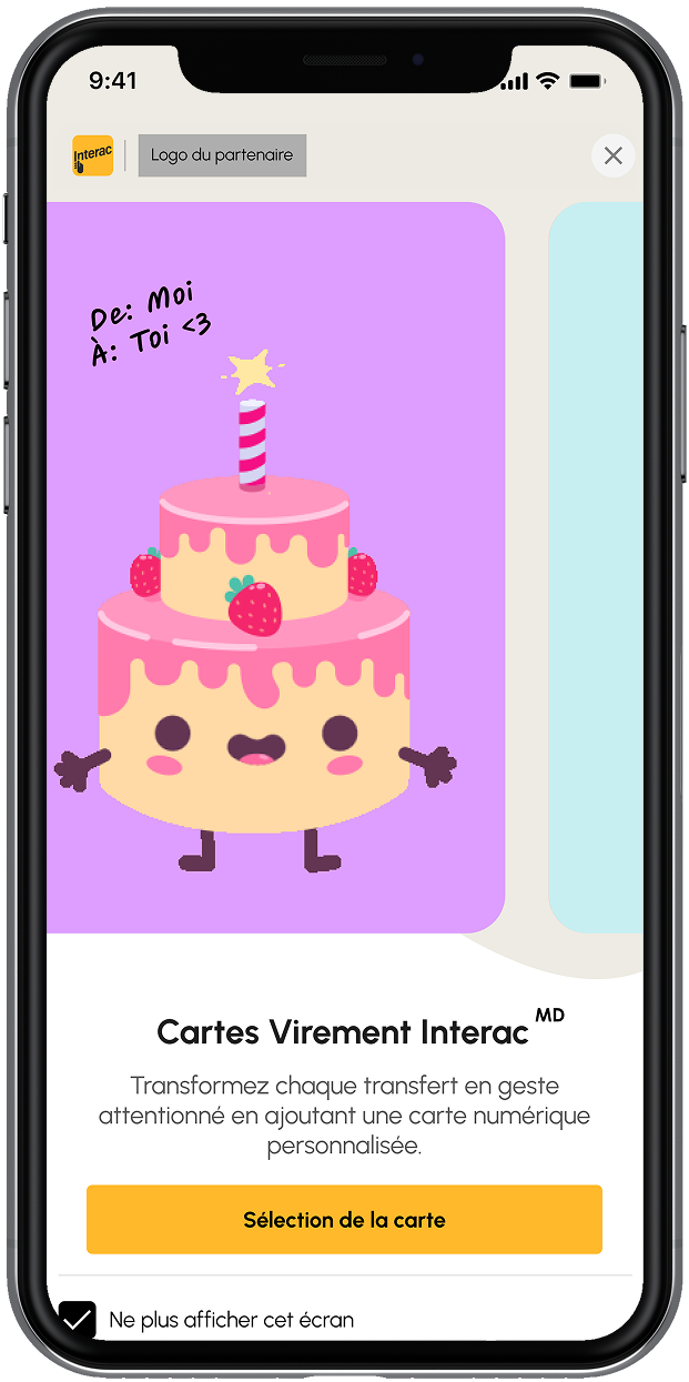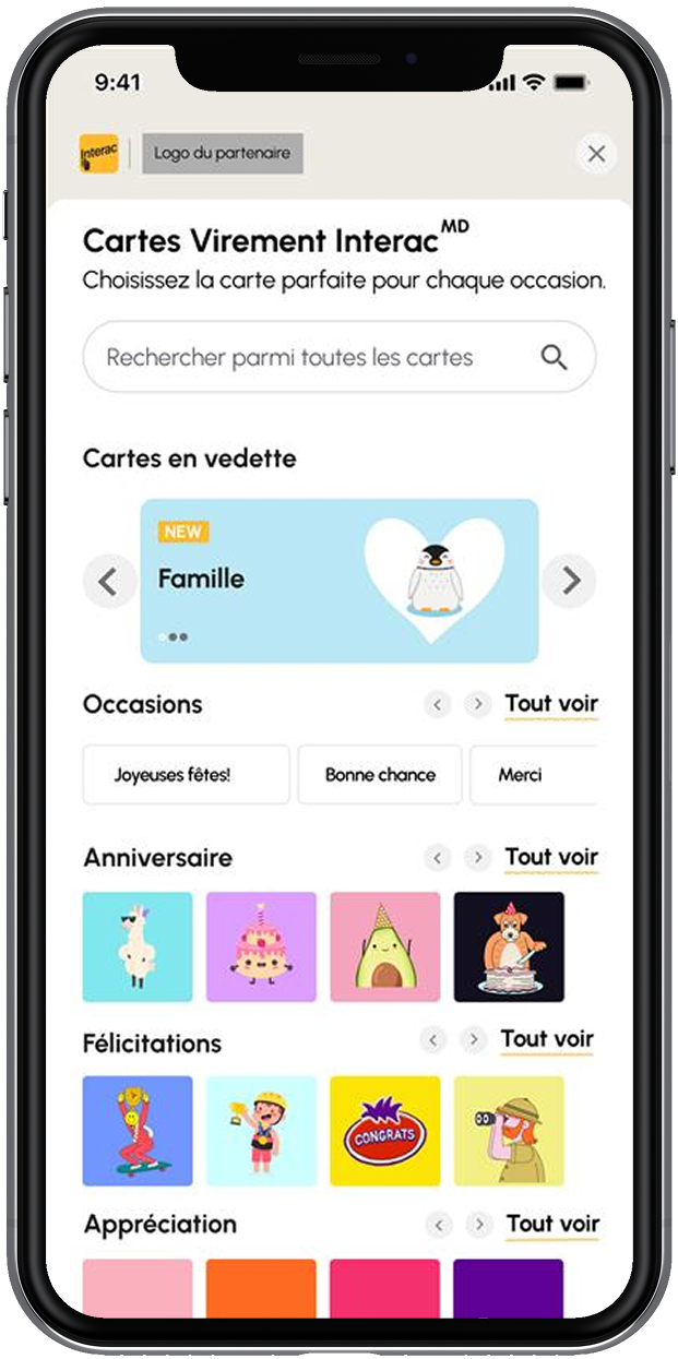 Grâce aux Cartes Virement Interac, outils numériques engageants et personnalisables pour toutes sortes d’occasions, vous pouvez transformer des transactions de tous les jours en des moments de rapprochement.