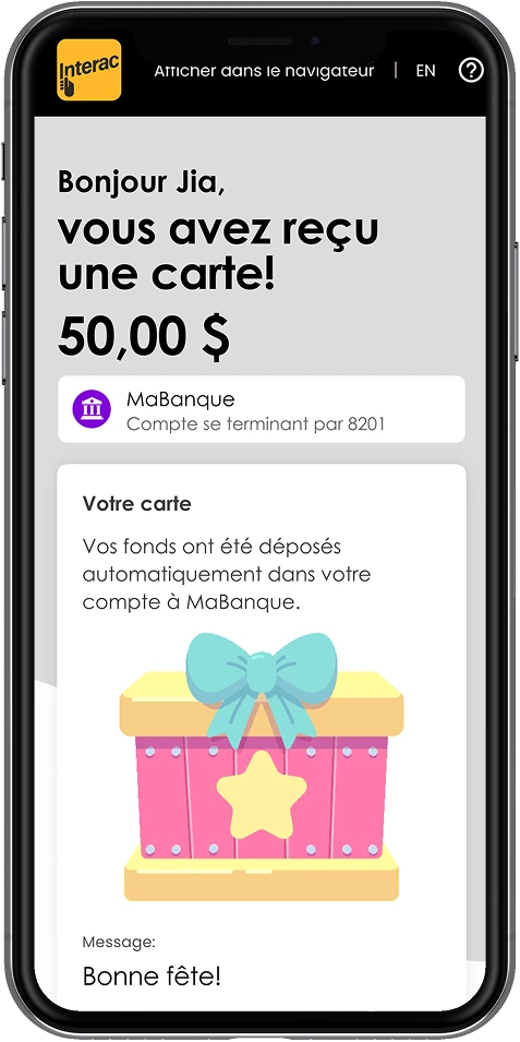 Ces cartes offrent tout ce que vous appréciez de l’envoi de fonds avec Virement Interac, en plus de la possibilité de personnaliser un message à l’intention de vos êtres chers.
